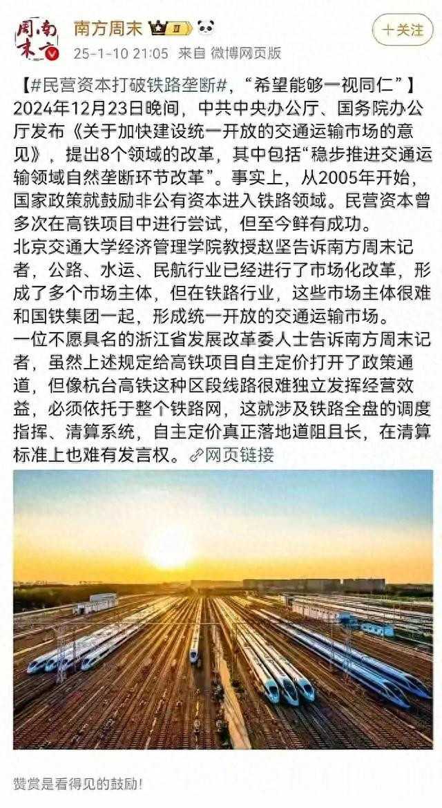 南方周末近日发文质疑铁路行业对民营资本“区别对待”,却选择性忽视了自然垄断行业最残酷的真相——资本只愿收割利润,不愿承担社会责任。这场持续二十年的铁路混改困局,本质是市场逐利性与公共产品属性的根本对立。